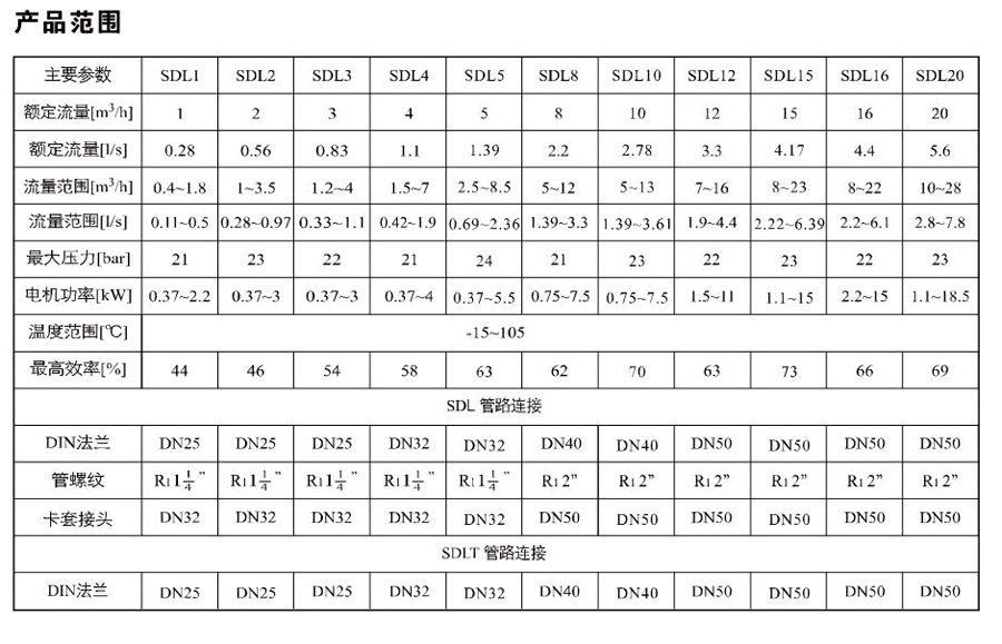 SDL20/SDLT20是一種多功能產品,可以輸送從自來水到工業(yè)液體的各種不同介質,適用于不同溫度、流量和壓力范圍。
