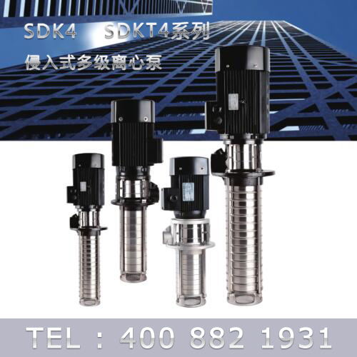 SDK4/SDKT4為配用標(biāo)準(zhǔn)電機(jī)的非自吸立式多級(jí)離心泵,電機(jī)軸和泵軸用聯(lián)軸器直接聯(lián)接的結(jié)構(gòu)。為滿足水槽或容器的安裝深度,可安裝空套的腔體來改變泵本身的侵入 深度。