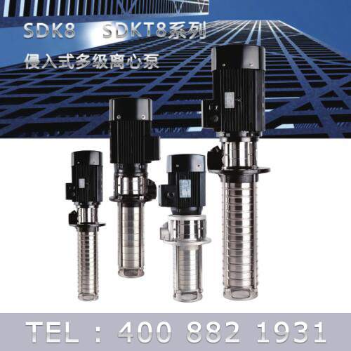 SDK8/SDKT8為配用標(biāo)準(zhǔn)電機(jī)的非自吸立式多級離心泵,電機(jī)軸和泵軸用聯(lián)軸器直接聯(lián)接的結(jié)構(gòu)。為滿足水槽或容器的安裝深度,可安裝空套的腔體來改變泵本身的侵入 深度。